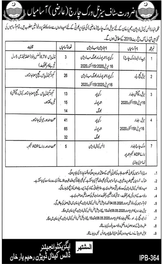 Jobs Employees Irrigation Department Rahim Yar Khan announce the Contract career opportunities for the post of See Below Ad in Punjab for the fresh and experienced candidates on Contract basis who have Check Advertisement degree. Posted date of this post is 19/04/2020 and the last date is 04/05/2020. if you are eligible for this job apply before due date.