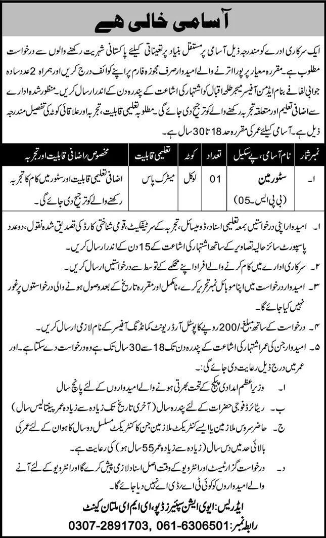 Jobs Government Sector Organization Multan Cantt Multan announce the Permanent career opportunities for the post of See Below Ad in Punjab,Multan for the fresh and experienced candidates on Permanent basis who have Check Advertisement degree. Posted date of this post is 06/12/2021 and the last date is 21/12/2021. if you are eligible for this job apply before due date.