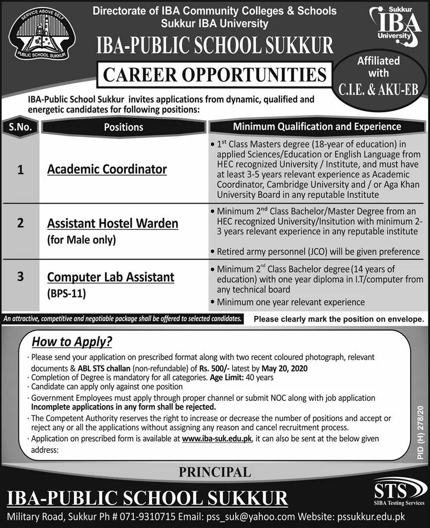 IBA Community Colleges And Schools announce the full-time career opportunities for the post of Assistant Hostel Warden,Academic Coordinator,Computer Lab Assistant in Sukkur city, Sindh, Pakistan for the fresh and experienced candidates on Permanent basis who have Masters degree . Posted date of this post is 03-05-2020 and the last date is 20-05-2020. If you are eligible for this job apply before the due date.