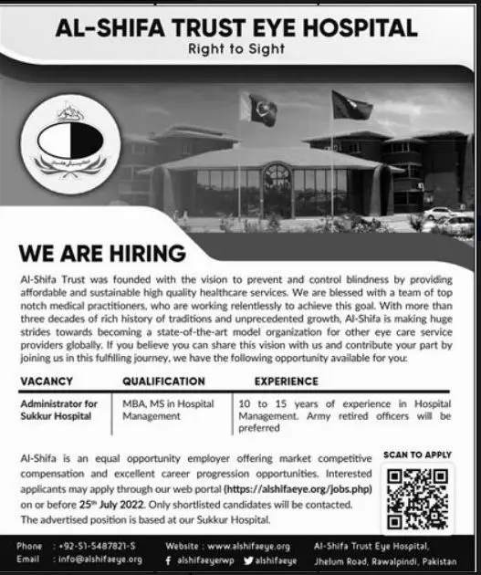 Al Shifa Trust Eye Hospital invites applications for job positions advertised in daily The News dated 17 July 2022 for following vacancies in Rawalpindi, rawalpindi Punjab Pakistan. opthalmic technician programmer registrar and opthalmologist MBBS, Master, MS and Bachelor etc. educational qualification will be preferred. Latest Private jobs in Al Shifa Trust Eye Hospital in Medical and others can be applied till NaN undefined NaN or as per closing date in newspaper ad. Read complete ad online to know how to apply on latest Al Shifa Trust Eye Hospital job opportunities.Last date to Apply 25 July 2022