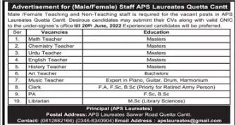 Jobs in Aps Leureates Quetta Cantt announce the Contract career opportunities for the post of See Below Ad in Balochistan, Quetta for the fresh and experienced candidates on Contract basis who have Check Advertisement degree. Posted date of this post is 02/06/2022 and the last date is 20/06/2022. if you are eligible for this job apply before due date.