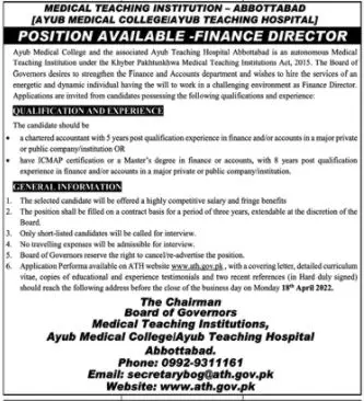Jobs In AYUB Medical and teaching Institution Abbottabad announce the Contract career opportunities for the post of See Below Ad in Khyber Pakhtunkhwa, Abbottabad for the fresh and experienced candidates on Contract basis who have Check Advertisement degree. Posted date of this post is 29/03/2022 and the last date is 18/03/2022. if you are eligible for this job apply before due date.