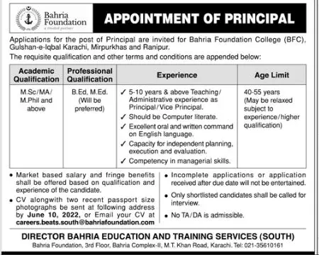 Jobs In Bahria Foundation College ( BFC) Karachi announce the Contract career opportunities for the post of See Below Ad in Sindh, Karachi for the fresh and experienced candidates on Contract basis who have Check Advertisement degree. Posted date of this post is 27/05/2022 and the last date is 10/06/2022. if you are eligible for this job apply before due date.