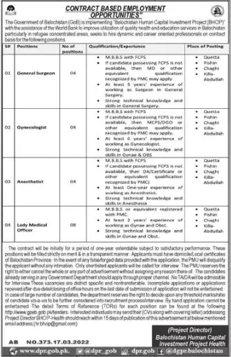 Jobs In Balochistan Human Capital Investment Project BHCIP announce the Contract career opportunities for the post of See Below Ad in Balochistan for the fresh and experienced candidates on Contract basis who have Check Advertisement degree. Posted date of this post is 18/03/2022 and the last date is 01/04/2022. if you are eligible for this job apply before due date.