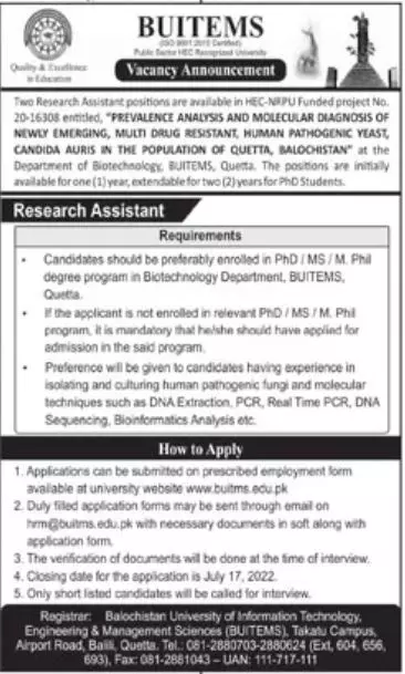 Jobs in Balochistan University of Information Technology announce the Contract career opportunities for the post of See Below Ad in Balochistan, Quetta for the fresh and experienced candidates on Contract basis who have Check Advertisement degree. Posted date of this post is 03/07/2022 and the last date is 17/07/2022. if you are eligible for this job apply before due date.