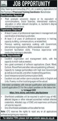 Jobs in Chip Training And Consulting CTC 2022 announce the Contract career opportunities for the post of See Below Ad in Balochistan, Quetta for the fresh and experienced candidates on Contract basis who have Check Advertisement degree. Posted date of this post is 25/07/2022 and the last date is 01/08/2022. if you are eligible for this job apply before due date.