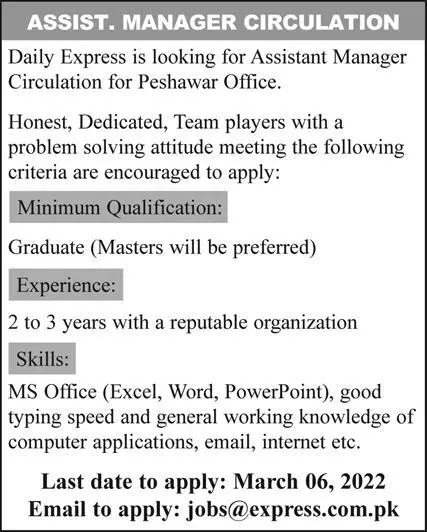 Jobs In Daily Express announce the Contract career opportunities for the post of See Below Ad in Peshawar for the fresh and experienced candidates on Contract basis who have Check Advertisement degree. Posted date of this post is 25/02/2022 and the last date is 06/03/2022. if you are eligible for this job apply before due date.