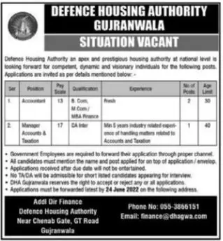 Jobs in Defence Housing Authority Gujranwala announce the Contract career opportunities for the post of See Below Ad in Punjab, Gujranwala for the fresh and experienced candidates on Contract basis who have Check Advertisement degree. Posted date of this post is 14/06/2022 and the last date is 24/06/2022. if you are eligible for this job apply before due date.