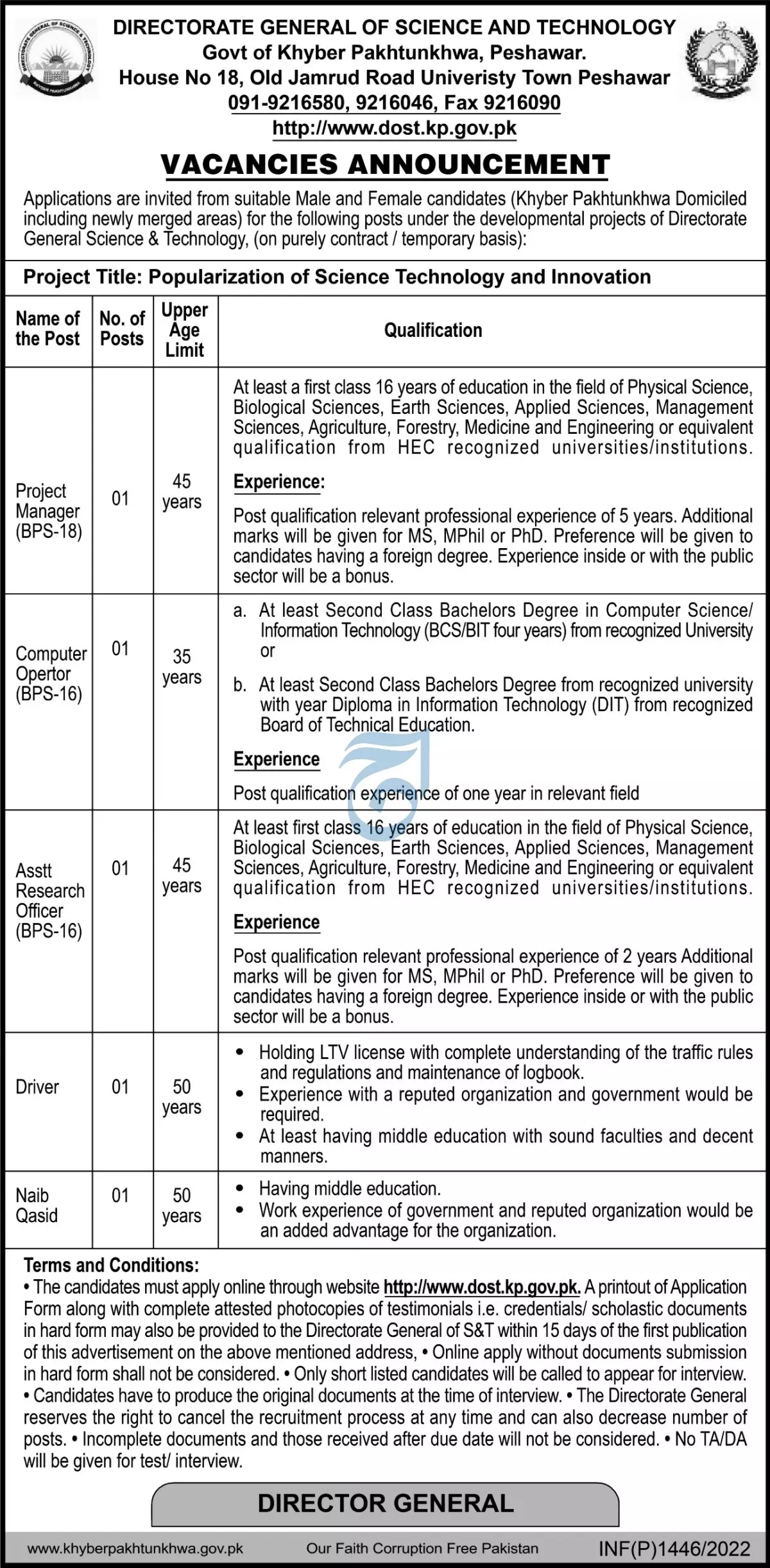 Jobs In Directorate of Science & Technology announce the Contract career opportunities for the post of See Below Ad in Khyber Pakhtunkhwa, Peshawar for the fresh and experienced candidates on Contract basis who have Check Advertisement degree. Posted date of this post is 12/03/2022 and the last date is 27/03/2022. if you are eligible for this job apply before due date.