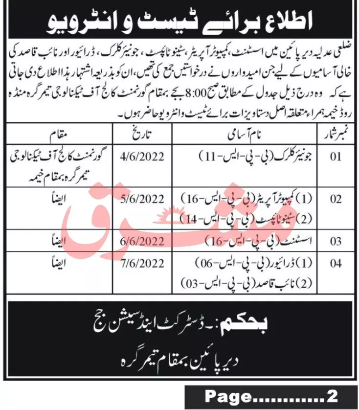 Jobs in District And Session Judge Timergara announce the Contract career opportunities for the post of See Below Ad in Khyber Pakhtunkhwa for the fresh and experienced candidates on Contract basis who have Check Advertisement degree. Posted date of this post is 01/06/2022 and the last date is 07/06/2022. if you are eligible for this job apply before due date.