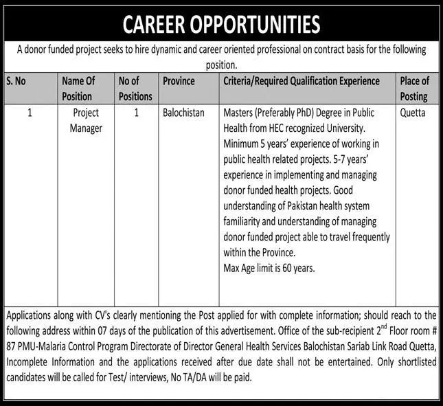 Jobs in Donor Funded Project Balochistan announce the Contract career opportunities for the post of See Below Ad in Balochistan, Quetta for the fresh and experienced candidates on Contract basis who have Check Advertisement degree. Posted date of this post is 23/06/2022 and the last date is 30/06/2022. if you are eligible for this job apply before due date.