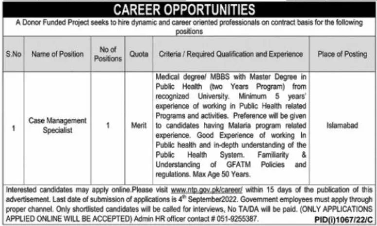 - Donor Funded Project Islamabad, islamabad Islamabad Pakistan invites applications from eligible candidates for the post of case management specialist as per advertisement of August 23, 2022 published in daily The News Newspaper.