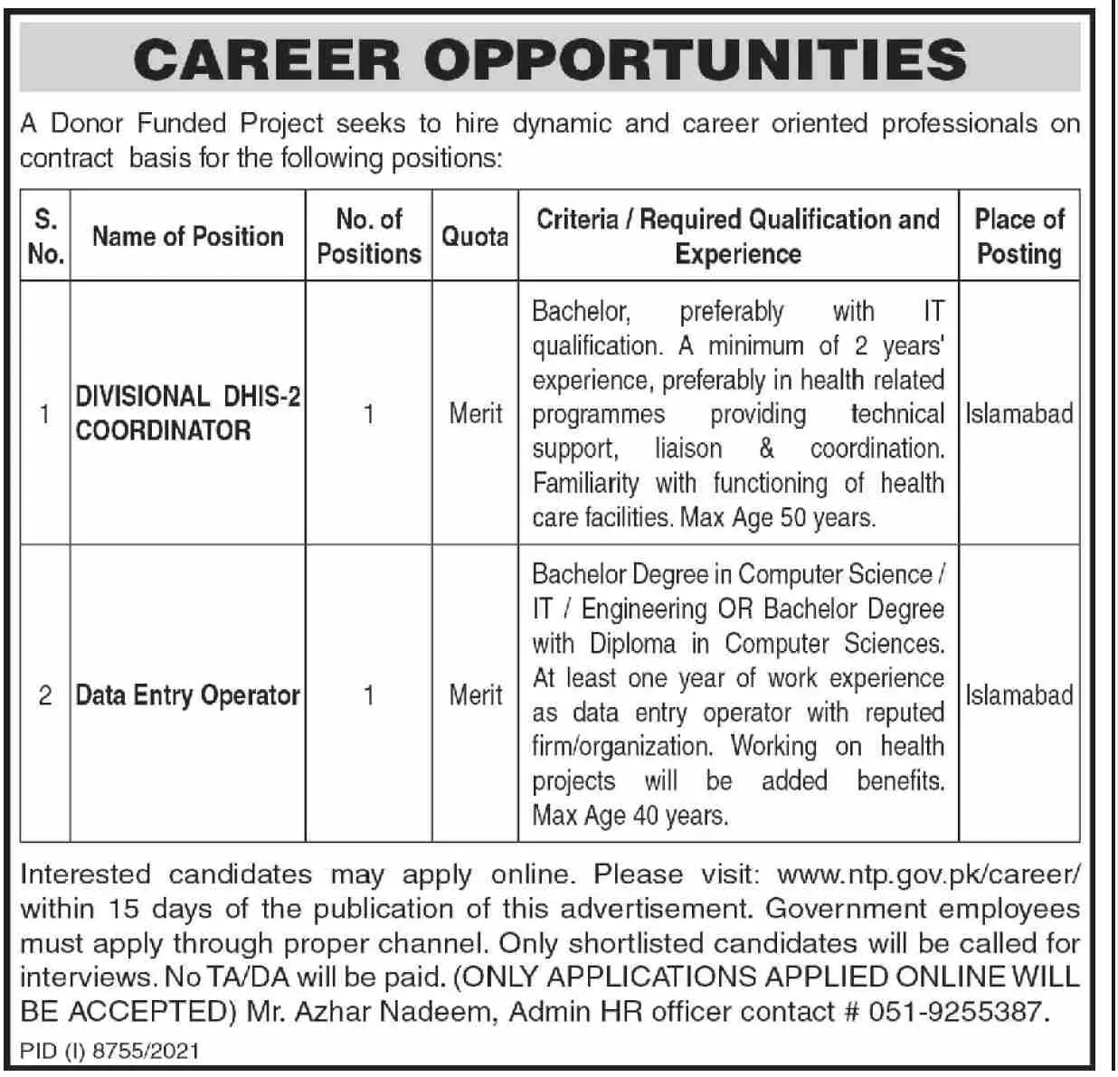 Jobs in Donor Funded Project Program Islamabad announce the Contract career opportunities for the post of See Below Ad in Federal, Islamabad for the fresh and experienced candidates on Contract basis who have Check Advertisement degree. Posted date of this post is 14/06/2022 and the last date is 29/06/2022. if you are eligible for this job apply before due date.