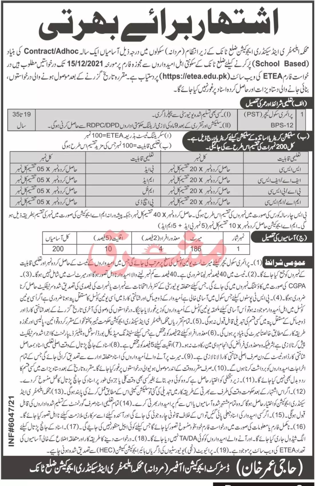 Jobs In Elementry & Secondary Education Distt Tanak kpk announce the Adhoc career opportunities for the post of See Below Ad in Khyber Pakhtunkhwa for the fresh and experienced candidates on Adhoc basis who have Check Advertisement degree. Posted date of this post is 30/11/2021 and the last date is 15/12/2021. if you are eligible for this job apply before due date.