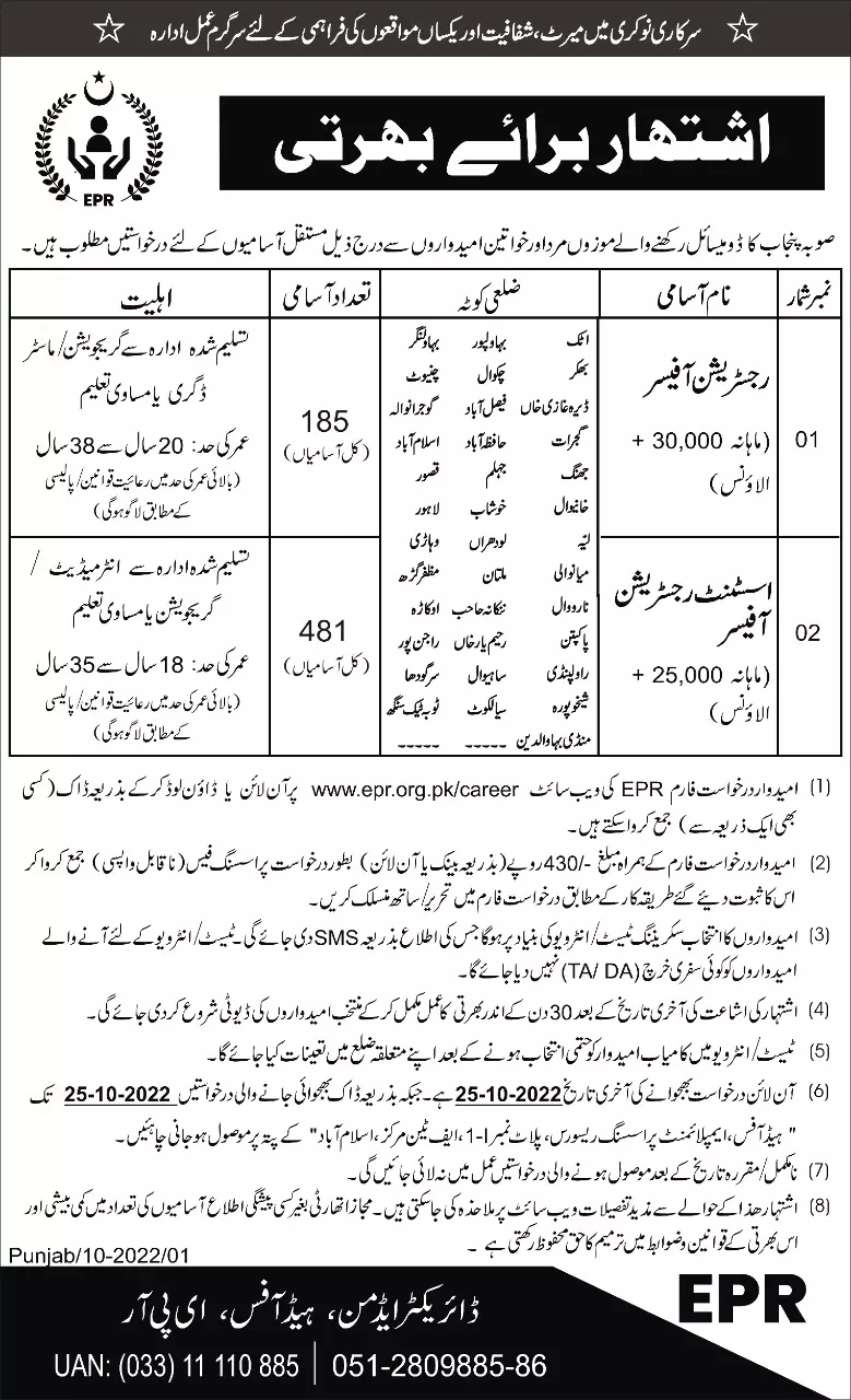 - According to the advertised details in the vacancy notice, the EPR is looking for Punjab Domicile holders Men & Women for its latest recruitment. Details are also uploaded on the EPR’s website www.epr.org.pk/career.