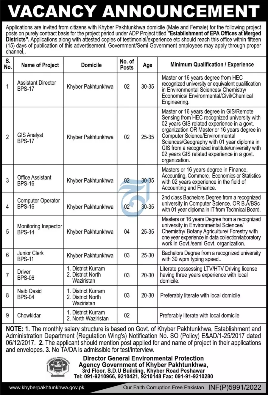 - Currently, the EPA KPK is seeking online applications for the recruitment of Assistant Director, GIS Analyst, Office Assistant, Computer Operator, Monitoring Inspector, Junior Clerk, Driver, Naib Qasid, and Chowkidar.