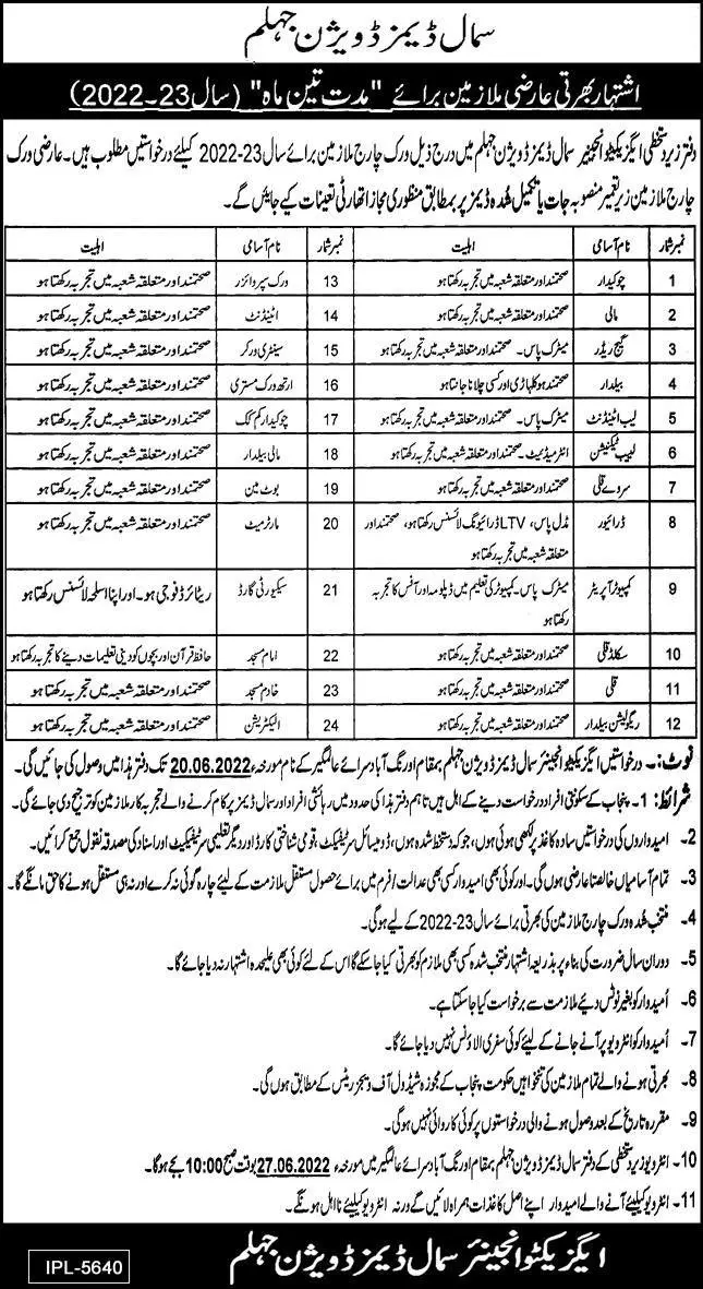 Jobs in Executive Engineer Small Dams Division Jhelum announce the Contract career opportunities for the post of See Below Ad in Punjab, Jhelum for the fresh and experienced candidates on Contract basis who have Check Advertisement degree. Posted date of this post is 01/06/2022 and the last date is 20/06/2022. if you are eligible for this job apply before due date.
