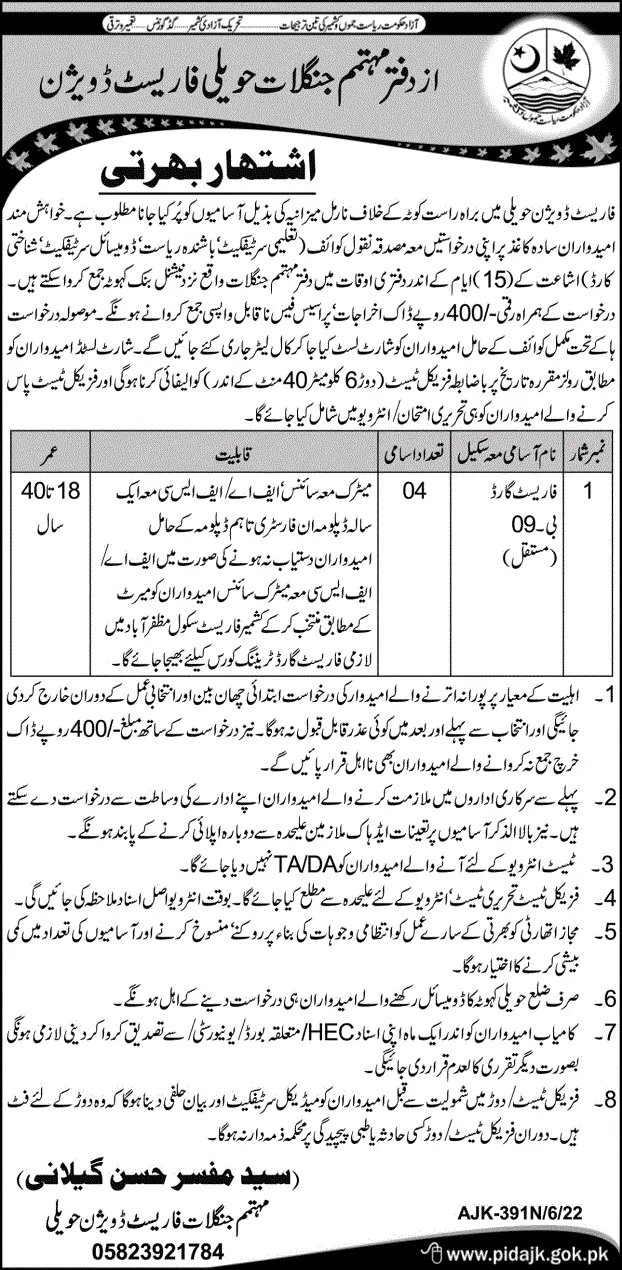 Jobs in Forest Department Azad Jammu Kashmir announce the Permanent career opportunities for the post of See Below Ad in Azad Jammu Kashmir for the fresh and experienced candidates on Permanent basis who have Check Advertisement degree. Posted date of this post is 14/06/2022 and the last date is 29/06/2022. if you are eligible for this job apply before due date.