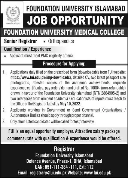 Jobs In Foundation University islamabad announce the Contract career opportunities for the post of See Below Ad in Federal, Islamabad for the fresh and experienced candidates on Contract basis who have Check Advertisement degree. Posted date of this post is 25/04/2022 and the last date is 10/05/2022. if you are eligible for this job apply before due date.