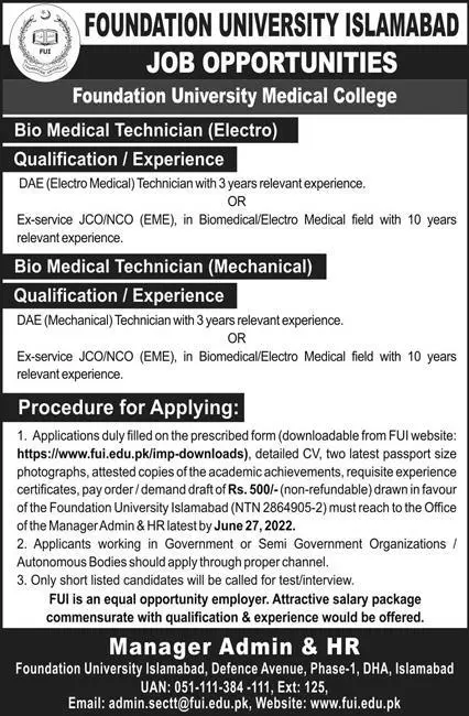 Jobs in Foundation University Islamabad announce the Contract career opportunities for the post of See Below Ad in Federal, Islamabad for the fresh and experienced candidates on Contract basis who have Check Advertisement degree. Posted date of this post is 16/06/2022 and the last date is 27/06/2022. if you are eligible for this job apply before due date.