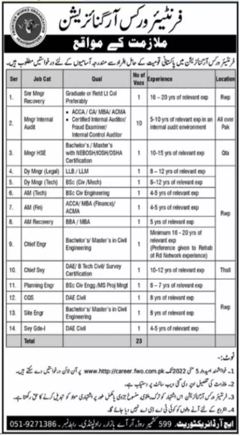 Jobs In Frontier Works Organization announce the Contract career opportunities for the post of See Below Ad in Punjab, Rawalpindi for the fresh and experienced candidates on Contract basis who have Check Advertisement degree. Posted date of this post is 28/04/2022 and the last date is 05/05/2022. if you are eligible for this job apply before due date.