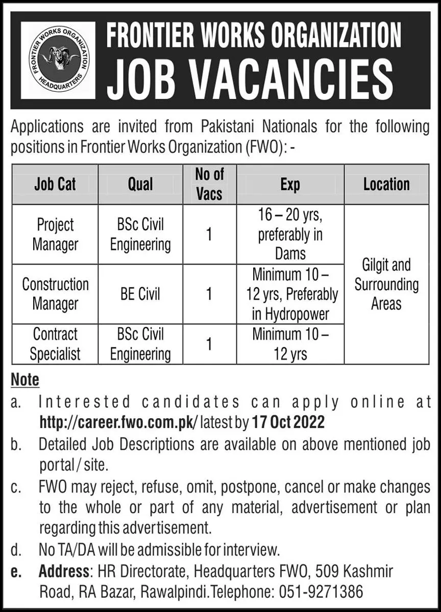 - Vacant posts including project manager, construction manager and contract specialist are announced in Frontier Works Organization FWO Rawalpindi, rawalpindi Punjab Pakistan as per 3 October 2022 advertisement in daily Nawaiwaqt Newspaper. Preferred Education is B.E etc.