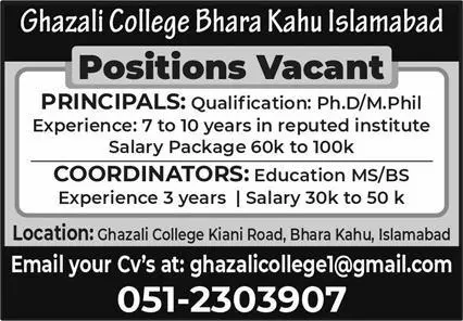 - Ghazali College is looking for candidates for following posts as per job advertisement published in daily Express Newspaper of October 9, 2022 for location Islamabad, islamabad Islamabad Pakistan: