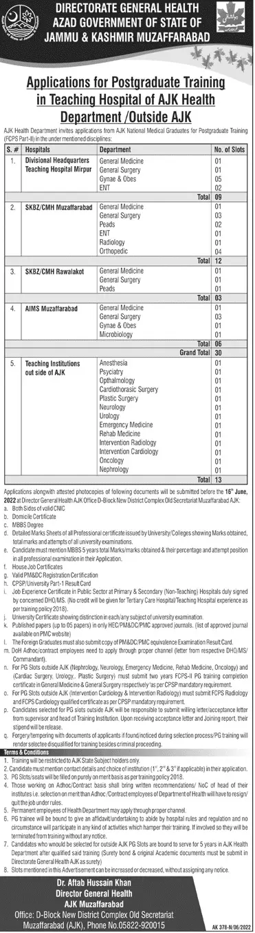 Jobs in Health Department Azad Jammu Kashmir announce the Contract career opportunities for the post of See Below Ad in Azad Jammu Kashmir for the fresh and experienced candidates on Contract basis who have Check Advertisement degree. Posted date of this post is 04/06/2022 and the last date is 16/06/2022. if you are eligible for this job apply before due date.
