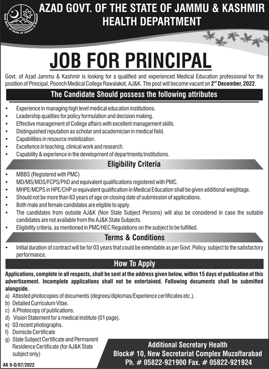 Jobs in Health Department azad kashmir announce the Contract career opportunities for the post of See Below Ad in Azad Jammu Kashmir, Muzaffarabad for the fresh and experienced candidates on Contract basis who have Check Advertisement degree. Posted date of this post is 16/07/2022 and the last date is 31/07/2022. if you are eligible for this job apply before due date.