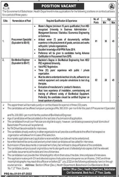 Jobs in Health Department Balochistan 2022 announce the Contract career opportunities for the post of See Below Ad in Balochistan, Quetta for the fresh and experienced candidates on Contract basis who have Check Advertisement degree. Posted date of this post is 02/07/2022 and the last date is 22/07/2022. if you are eligible for this job apply before due date.