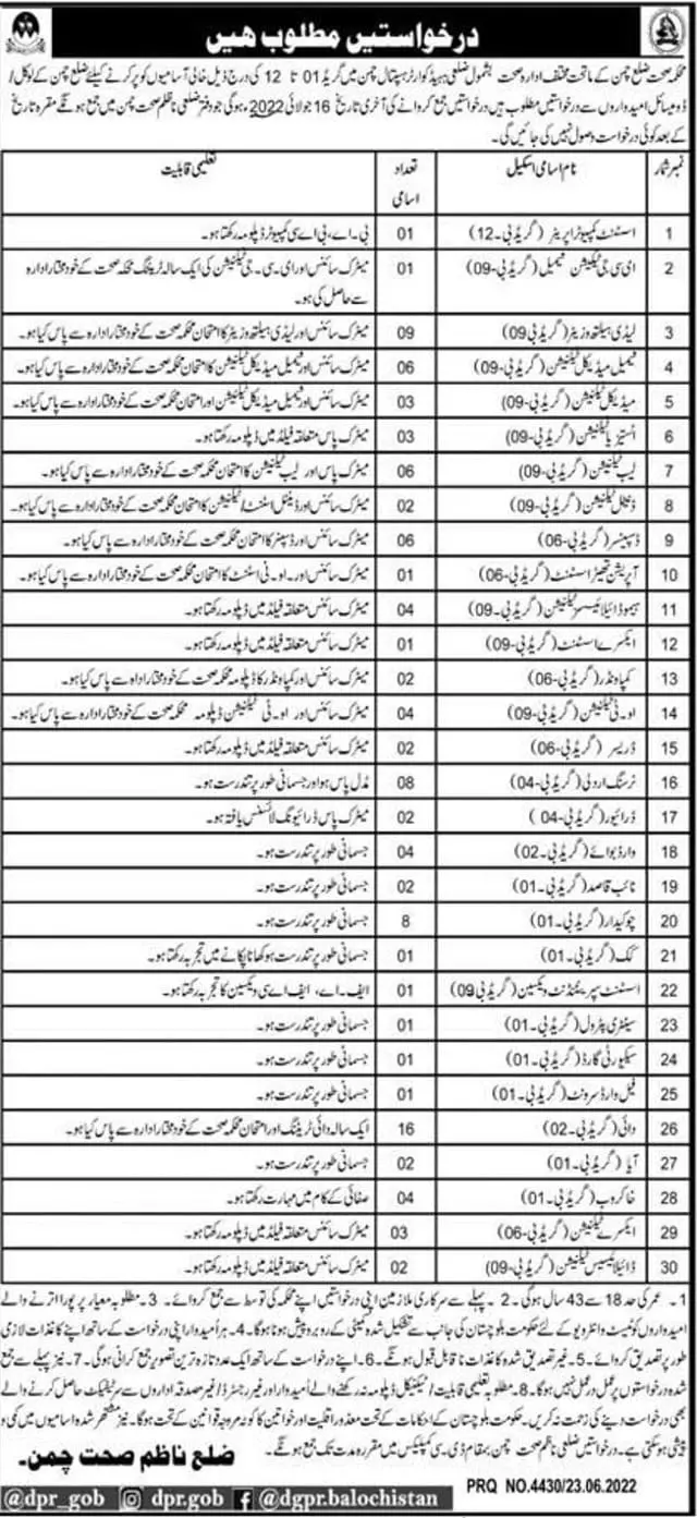 Jobs in Health Department Chaman Balochistan 2022 announce the Permanent career opportunities for the post of See Below Ad in Balochistan, Chaman for the fresh and experienced candidates on Permanent basis who have Check Advertisement degree. Posted date of this post is 24/06/2022 and the last date is 15/07/2022. if you are eligible for this job apply before due date.