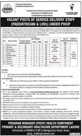 - P&SHD Punjab is implementing the Punjab Human Capital Investment Project with the financial assistance of the World Bank. The project is hiring applications for the appointment of Lady Health Visitors and Pediatricians.