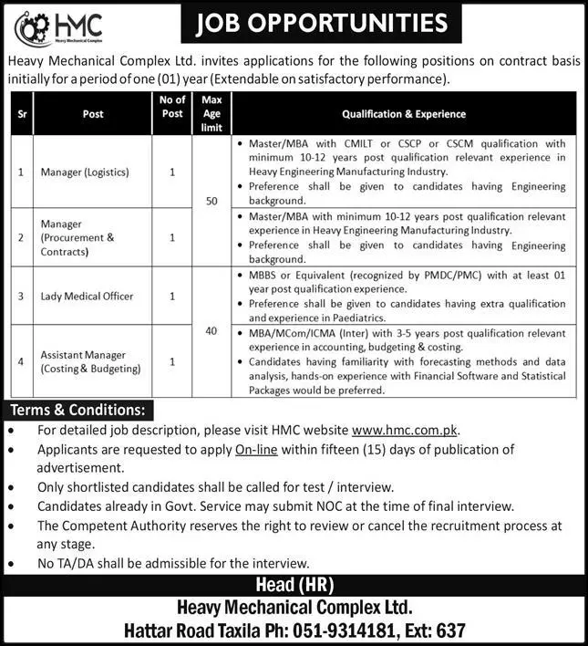 Heavy Mechanical Complex HMC is looking for candidates for following posts as per job advertisement published in daily The News Newspaper of July 31, 2022 for location Taxila, taxila Punjab Pakistan: lady medical officer assistant manager manager procurement and manager logistics Candidates with MBBS, Master, MBA and Bachelor etc.