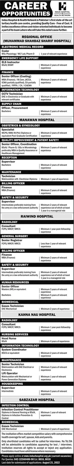 Jobs in Indus Hospital & hospital & Health Network announce the Contract career opportunities for the post of See Below Ad in Punjab, Lahore for the fresh and experienced candidates on Contract basis who have Check Advertisement degree. Posted date of this post is 07/08/2022 and the last date is 21/08/2022. if you are eligible for this job apply before due date.
