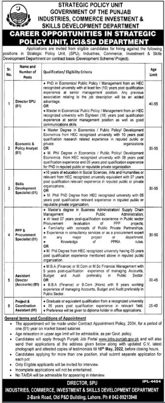 Jobs In Industries commerce and investment department Punjab announce the Contract career opportunities for the post of See Below Ad in Punjab, Lahore for the fresh and experienced candidates on Contract basis who have Check Advertisement degree. Posted date of this post is 28/04/2022 and the last date is 16/05/2022. if you are eligible for this job apply before due date.