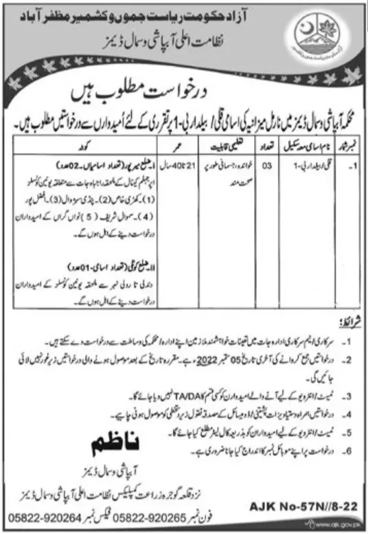 Jobs in Irrigation Department Azad Jammu Kashmir announce the Contract career opportunities for the post of See Below Ad in Azad Jammu Kashmir for the fresh and experienced candidates on Contract basis who have Check Advertisement degree. Posted date of this post is 26/08/2022 and the last date is 05/09/2022. if you are eligible for this job apply before due date.
