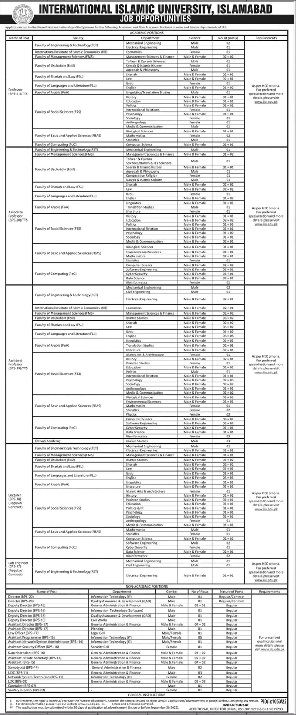 - Complete information on these vacancies regarding Eligibility Terms & Conditions and Application Procedure is available on the University’s website www.iiu.edu.pk.