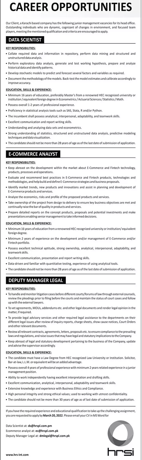 Jobs In Karachi Based Company 2022 announce the career opportunities for the post of in for the fresh and experienced candidates on basis who have degree. Posted date of this post is 27/02/2022 and the last date is 20/03/2022. if you are eligible for this job apply before due date.
