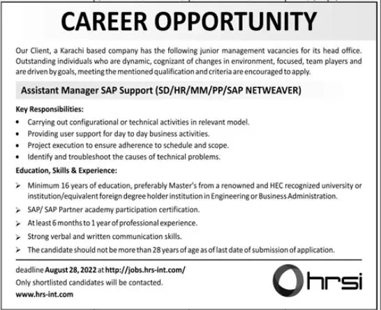 Human Resource Solution International HRSI is looking for candidates for following posts as per job advertisement published in daily Jang Newspaper of August 14, 2022 for location Karachi, karachi Sindh Pakistan: assistant manager sap support Educational qualifications required Bachelor and Master etc.