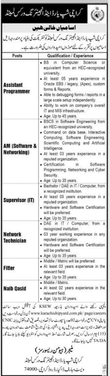 Jobs in Karachi Shipyard and Engineering Works Limited announce the Contract career opportunities for the post of See Below Ad in Sindh, Karachi for the fresh and experienced candidates on Contract basis who have Check Advertisement degree. Posted date of this post is 03/07/2022 and the last date is 18/07/2022. if you are eligible for this job apply before due date.