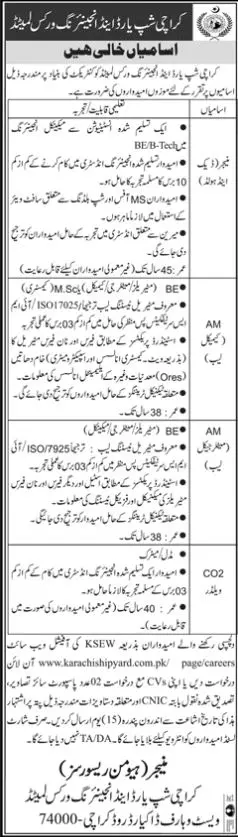 Karachi Shipyard and Engineering Works Limited is seeking Manager Deck & Hold, AM Chemical Lab, AM Metallurgical Lab, and CO2 Welder.