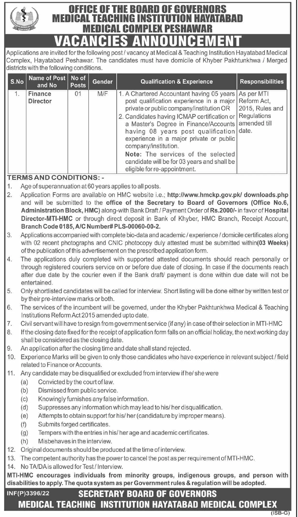 Jobs in Medical Teaching institute Hayatabad Khyber Pakhtunk announce the Contract career opportunities for the post of See Below Ad in Khyber Pakhtunkhwa, Peshawar for the fresh and experienced candidates on Contract basis who have Check Advertisement degree. Posted date of this post is 11/06/2022 and the last date is 25/06/2022. if you are eligible for this job apply before due date.