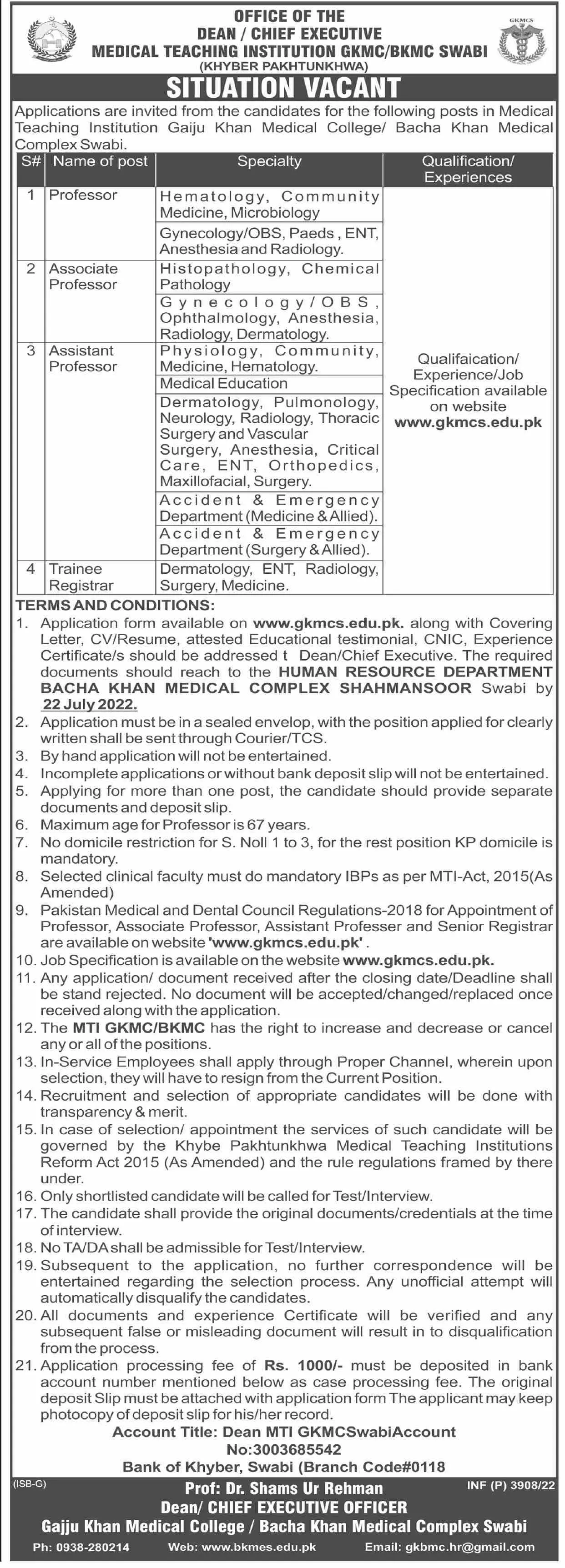 Jobs in Medical Teaching institution GKMC Swabi announce the Contract career opportunities for the post of See Below Ad in Khyber Pakhtunkhwa, Swabi for the fresh and experienced candidates on Contract basis who have Check Advertisement degree. Posted date of this post is 02/07/2022 and the last date is 22/07/2022. if you are eligible for this job apply before due date.