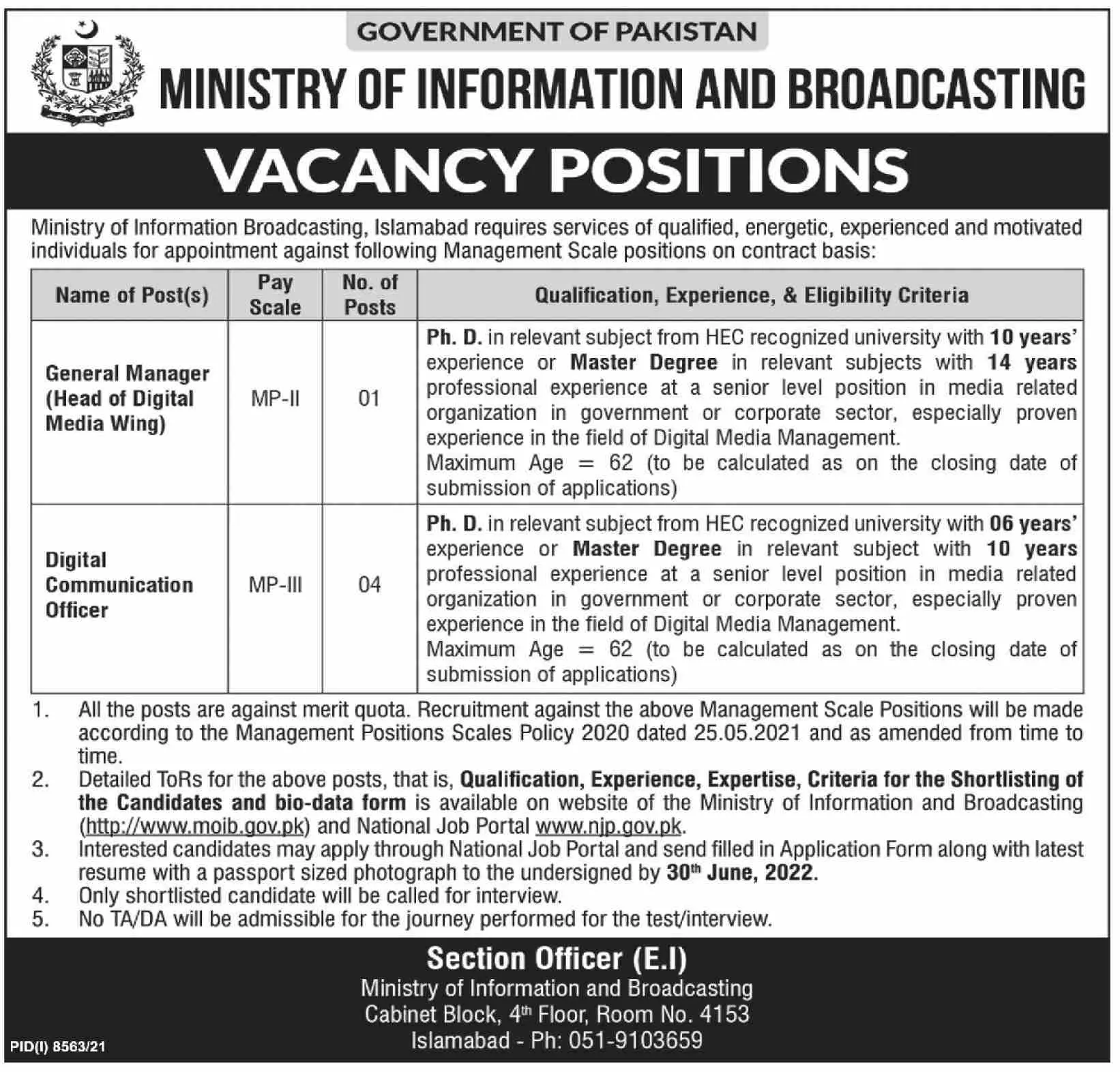 Jobs in Ministry of information And Broadcasting Islamabad announce the Contract career opportunities for the post of See Below Ad in Federal, Islamabad for the fresh and experienced candidates on Contract basis who have Check Advertisement degree. Posted date of this post is 05/06/2022 and the last date is 30/06/2022. if you are eligible for this job apply before due date.