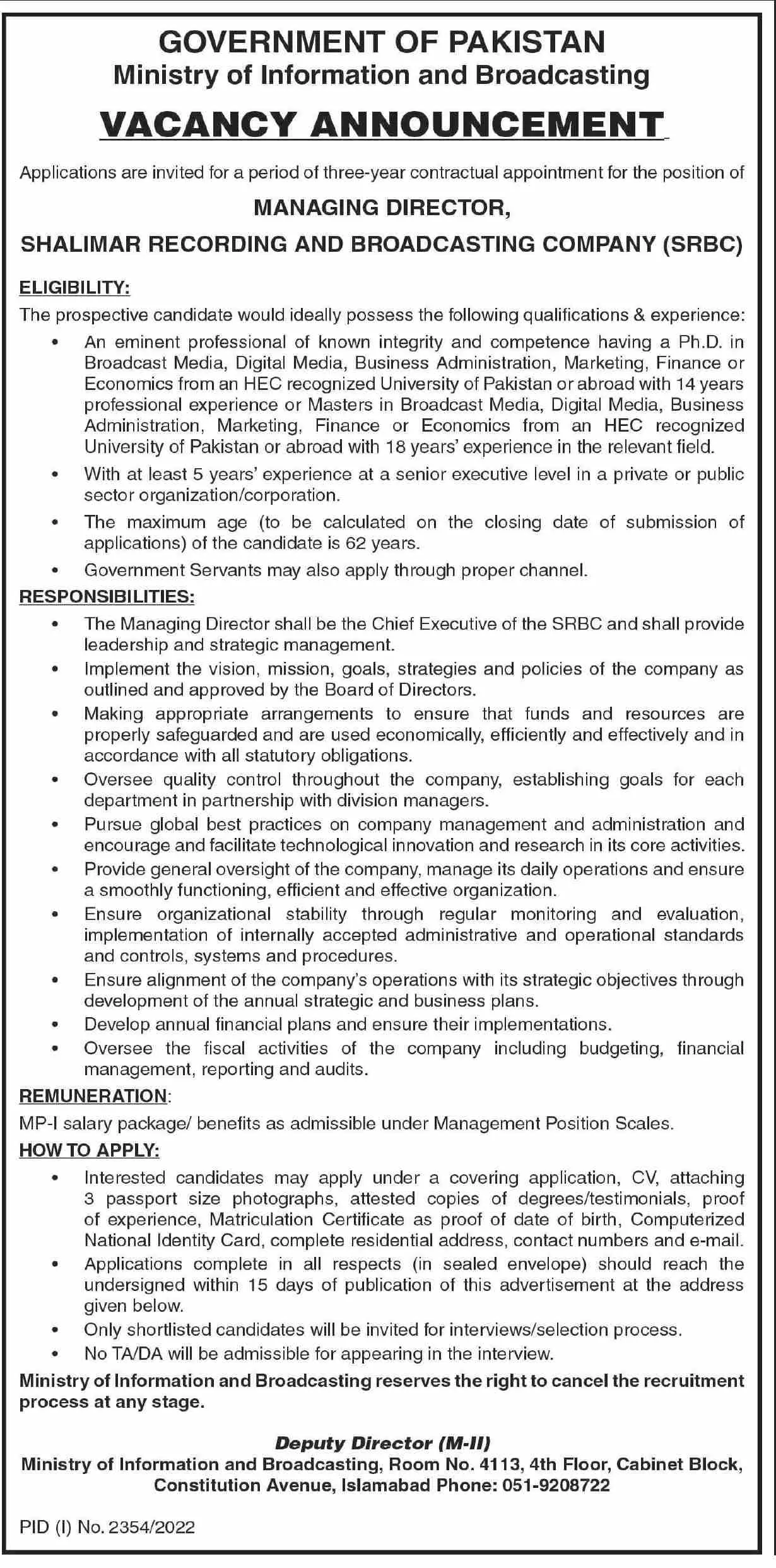 - Ministry of Information and Broadcasting jobs advertisement dated about 14 October 2022 in daily Jang Newspaper invites application for the vacant post of managing director in Islamabad, islamabad Islamabad Pakistan.