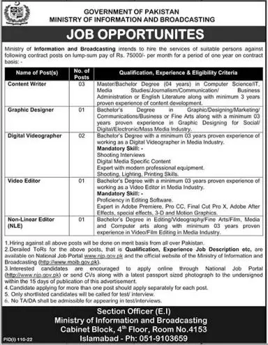Jobs in Ministry of Information & Broadcasting announce the Contract career opportunities for the post of See Below Ad in Federal, Islamabad for the fresh and experienced candidates on Contract basis who have Check Advertisement degree. Posted date of this post is 06/07/2022 and the last date is 21/07/2022. if you are eligible for this job apply before due date.