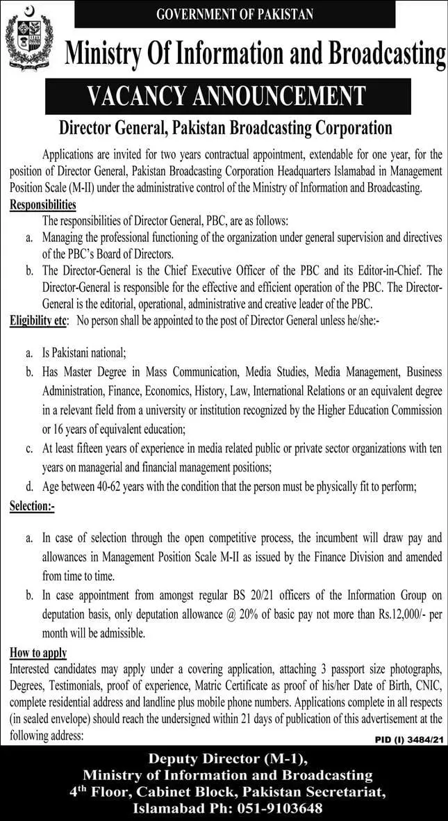 Jobs In Ministry Of Information & Broadcasting Islamabad announce the Contract career opportunities for the post of See Below Ad in Islamabad for the fresh and experienced candidates on Contract basis who have Check Advertisement degree. Posted date of this post is 29/11/2021 and the last date is 20/12/2021. if you are eligible for this job apply before due date.