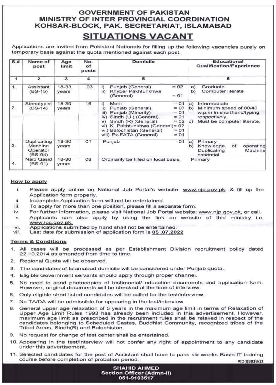 Jobs in Ministry of Inter Provincial Coordintion announce the Contract career opportunities for the post of See Below Ad in Federal, Islamabad for the fresh and experienced candidates on Contract basis who have Check Advertisement degree. Posted date of this post is 19/06/2022 and the last date is 05/07/2022. if you are eligible for this job apply before due date.