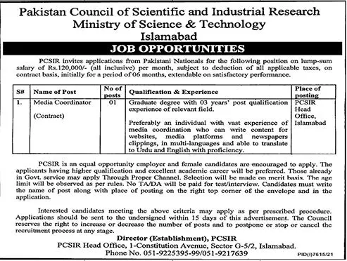 Jobs In Ministry of Science and Technology Islamabad announce the Contract career opportunities for the post of See Below Ad in Federal, Islamabad for the fresh and experienced candidates on Contract basis who have Check Advertisement degree. Posted date of this post is 29/04/2022 and the last date is 14/05/2022. if you are eligible for this job apply before due date.
