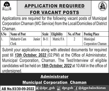 Jobs in Municipal Corporation Chaman Balochistan announce the Contract career opportunities for the post of See Below Ad in Balochistan, Chaman for the fresh and experienced candidates on Contract basis who have Check Advertisement degree. Posted date of this post is 03/10/2022 and the last date is 13/10/2022. if you are eligible for this job apply before due date.